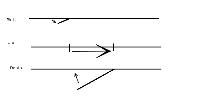 The image below shows my understanding of birth, life and death from the perspective of eternity. Death is a folding back into eternity. Nothing is lost from God’s eye view: I came into being, and my being will never be taken away (from the perspective of eternity). I believe that it is possible to experience eternity in the now, as in practice stillness of body and mind found in meditation, contemplation or mindfulness. Paradoxically, this experience is only fleeting (I say paradoxically, because in the context of eternity it is odd to speak of something being fleeting or temporary). I think that as I live in the time between birth and death I can easily be unmindful of the present moment, by being preoccupied with things that have happened or things that have yet to happen. In silence and stillness it is possible to become one with eternity, knowing that in another moment my mind may have wandered back into the dimensions of time in which I live my ordinary life. However, it is in the evanescent experience of eternity that I prepare for death, the point at which all of my time-bound life gets folded up and taken into eternity.