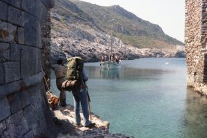 We were up at 5am and attended mattins for a while, and then set off. We had planned to walk around the tip of the peninsula the following day, but I think we took the wrong path, because that the going was rough and we ended up at Ag Theodoros, which is off the main path. From there we made our way down the cliffs to the sea and had a swim. We knew that we would not make it to Aghios Pavlos that day, and thanks to a pocket mirror of George’s we signalled a passing boat, which to our great and intense delight responded and gave us the much-needed ride to Pavlos.