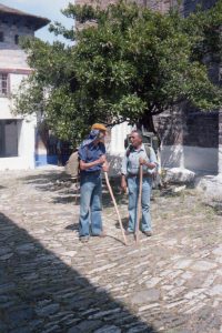 We walked to Pantocratoros, and managed to get ourselves lost for a while (we were not equipped with high quality maps: I didn’t obtain the Zwerger map until a subsequent visit). We were saved by a friendly monk at the Kellion of Ag. Giorgos, who welcomed us with ouzo and loukoumi. We finally reached Pantocratoros, and in the afternoon did a risky and unacceptable thing when we went off to a sheltered cove well out of sight of the monastery and had a refreshing swim. I wouldn’t risk doing that now! We had a difficult night at the monastery where we were kept awake by a couple of pilgrims who argued loudly with each other until the early hours, and we were then up at 4.00am to attend the morning liturgy.